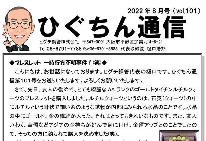 ひぐちん通信 ひぐちん通信 vol.101 を公開しました。 2022.08.17 ひぐちん通信 📄 PDFでご覧いただけます。 ひぐちん通信 vol.100 を公開しました。 前の記事 [446]鉄のカラー(赤錆び止め)角パイプが新しく一部在庫に加わりました! 次の記事 ひぐちん通信 vol.27 を公開しました。 2016.06.15