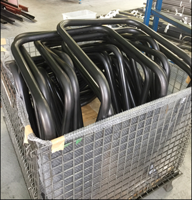 網パレを支給して頂きキズ防止のため緩衝材やダンボールでカバーしています。大型NCベンダーでの曲げのため、他の曲げ加工品より少し納期をいただいておりますが、タイミングが合えば短納期対応も可能です。