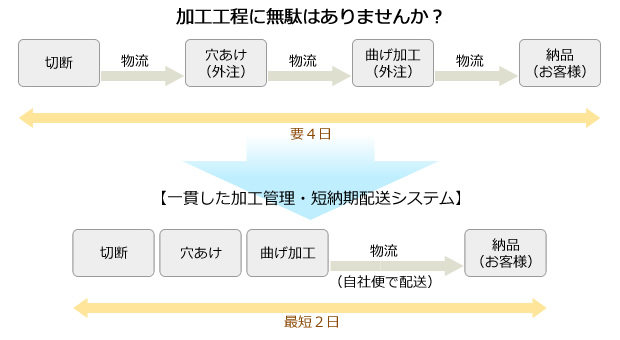 ヒグチ鋼管の「一貫した加工管理・短納期配送システム」を活用すれば、これまで自社工場や外注工場で行っていた加工工程を考えずに済みます。
